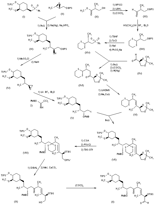 The intermediates (I) and (II) are synthesized as follows: Intermediate (I): The carboxylic acid (VIII) is condensed with N-methoxy-N-methylamine by means of dicyclohexylcarbodiimide (DCC) in dichloromethane to the amide (IX), which is treated with the vinyl iodide (X) and butyllithium in ethyl ether to yield the ketone (XI). The reduction of (XI) with LiAlH4 followed by methylation with MeI and NaH in DMF affords the methoxy compound (XII), which by treatment with camphorsulfonic acid (CSA), triethylamine and K2CO3 in methanol is converted to the epoxide (XIII). The condensation of (XIII) with the iodo ether (XIV) by means of butyllithium followed by silylation with triisopropylsilyl trifluoromethanesulfonate in dichloromethane and iodination with N-iodosuccinimide (NIS) in THF gives the protected triol (XV), which is selectively oxidized with 2,3-dichloro-5,6-dicyano-1,4-benzoquinone (DDQ) and oxalyl chloride in DMSO/dichloromethane, yielding the aldehyde (XVI). The condensation of (XVI) with the oxazolidinone (XVII) by means of tributylboron trifluoromethanesulfonate in toluene/dichloromethane affords compound (XVIII), which is treated with LiOH and H2O2 in THF/water. The resulting free acid is methylated with diazomethane, and the free hydroxyl group is acetylated with acetic anhydride to the acetoxy ester (XIX). Finally, (XIX) is hydrolyzed with LiOH in methanol/water to afford intermediate (I) (see A.D. Piscopio et al., J Chem Soc Chem Commun 1993, 7: 617). (1,2)