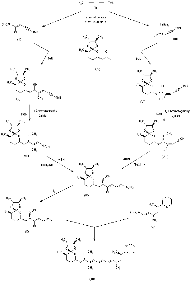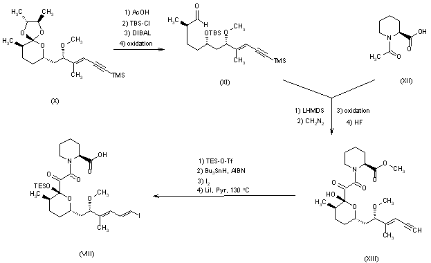 The intermediate piperidine carboxylic acid (VIII) was obtained as follows: The acetylene orthoester (X) was submitted sequentially to hydrolysis with acetic acid, silylation with TBS-Cl, reduction with DIBAL and Swern oxidation to give the acetylenic aldehyde (XI), which was condensed with 1-acetylpiperidine-2-carboxylic acid (XII), and the resulting compound was esterified with diazomethane, submitted to a Dess-Martin oxidation yielding a tricarbonyl compound that, without isolation was desilylated with HF yielding the cyclic hemiketal (XIII). This hemiketal was silylated with TES-triflate and submitted to hydrostannylation with tributyl tin hydride and AIBN, and tin - iodine exchange with I2/LiI in pyridine at 130 C to afford the desired (E,E)-divinylene iodide fragment (VIII). The syntheses of the starting fragments (I), (II), (IV), (X) and (XII) has already been reported (see Smith, A.B. et al. Tetrahedron Lett 1994, 35(28): 4907 and Smith, A.B. et al. Tetrahedron Lett 1994, 35(28): 4911).