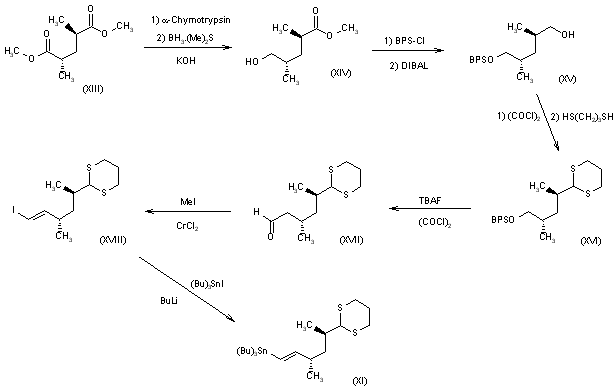 The vinyl stannane fragment (XI) of the preceding synthesis (scheme 1756502a) is obtained as follows: Treatment of the meso-2,3-dimethylglutaric acid dimethyl ester (XIII) with alpha-chymotrypsin followed by reduction with borane.dimethylsulfide gives the chiral hydroxy ester (XIV), which is protected with BPSCl and the ester group reduced with DIBAL to afford the partially protected diol (XV). The oxidation of (XV) with oxalyl chloride and protection of the resulting aldehyde with propane-1,3-dithiol give the dithiane (XVI), which is deprotected with TBAF and oxidized with oxalyl chloride to yield the aldehyde (XVII). The olefination of (XVII) with methyl iodide and CrCl2 affords the trans-vinyl iodide (XVIII), which is finally treated with butyllithium and tributylstannyl bromide in ethyl ether to give the vinyl stannane fragment (XI).