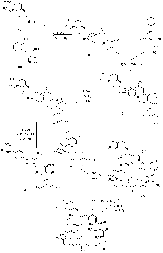 A total synthesis of rapamycin has been described: The condensation of the iodo-compound (I) with dithiane (II) by means of tert-butyllithium in THF followed by elimination of the acetal group with trichloroacetic acid gives the aldehyde (III), which is condensed with the dithiane (IV) by means of tert-butyllithium in THF, and the resulting compound methylated with NaH and methyl iodide to afford the acetal (V) as a diastereomeric mixture (in the newly formed methoxy group) that was resolved by flash chromatography. The sequential reaction of (V) first with p-toluenesulfonic acid to hydrolyze the acetal group, and then with CBr4 in THF/HMPT and finally with butyllithium in THF gives the terminal acetylene derivative (VI). Elimination of the dithiane and PMB groups, and reaction with tributyl tin hydride affords the trans-vinylene alcohol (VII), which is esterified with piperidine carboxylic acid (VIII) by means of 1-[3-(dimethylamino)propyl]-3-ethylcarbodiimide (EDC) and DMAP in dichloromethane yielding the condensation ester (IX). Finally, this compound is submitted to an intramolecular Stille cyclization with the tris(2-furyl)phosphine palladium dichloride complex in DMF/THF, which after desilylation with tetrabutylammonium fluoride (TBAF) and HF.pyridine afforded rapamycin.