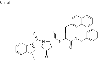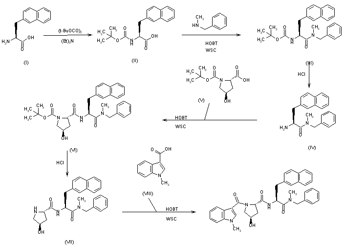 The protection of the amino group of L-(2-naphthyl)alanine (I) with di-tert-butyl dicarbonate and triethylamine gives N-tert-butoxycarbonyl-L-(2-naphthyl)alanine (II), which is amidated with benzylmethylamine by means of hydroxybenzotriazole (HOBT) and 1-ethyl-3-[3-(dimethylamino)propyl]carbodiimide (WSC) in dichloromethane yielding N-tert-butoxycarbonyl-L-(2-naphthyl)alanine N-benzyl-N-methylamide (III). Elimination of the tert-butoxycarbonyl group of (III) with HCl in dioxane affords L-(2-naphthyl)alanine N-benzyl-N-methylamide (IV), which is condensed with N-(tert-butoxycarbonyl)-[4(R)-hydroxy]-L-proline (V) by means of HOBT an WSC as before giving the protected dipeptide (VI). Elimination of the protecting group of (VI) with HCl in dioxane as before yields the dipeptide (VII) with the free amino group, which is finally acylated with 1-methylindole-3-carboxylic acid (VIII) by means of HOBT and WSC as before.