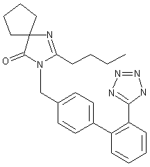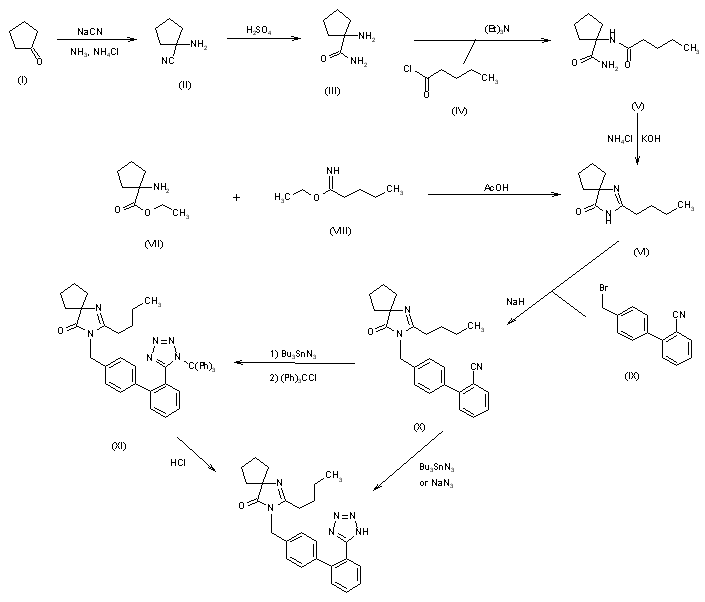 The reaction of cyclopentanone (I) with sodium cyanide, NH3 and NH4Cl in hot methanol/water gives 1-aminocyclopentanecarbonitrile (II), which is partially hydrolyzed with concentrated H2SO4 to the corresponding amide (III). The acylation of (III) with pentanoyl chloride (IV) by means of triethylamine in THF yields 1-(pentanamido)cyclopentane-1-carboxamide (V), which, without isolation, is cyclized by means of KOH in refluxing methanol/water to afford 2-butyl-1,3-diazaspiro[4.4]non-1-en-4-one (VI). This compound (VI) can also be obtained by cyclization of 1-aminocyclopentanecarboxylic acid ethyl ester (VII) with pentanimidic ethyl ester (VIII) by means of acetic acid in refluxing xylene. The condensation of (VI) with 4'-(bromomethyl)biphenyl-2-carbonitrile (IX) by means of NaH in DMF gives 4'-(2-butyl-4-oxo-1,3-diazaspiro[4.4]non-1-en-3-ylmethyl)biphenyl-2-carbonitrile (X). Cyclization of (X) with tributyltin azide in refluxing xylene, followed by reaction with trityl chloride in DMF, affords 2-butyl-3-[2'-[1-(triphenylmethyl)tetrazol-5-yl]biphenyl-4-ylmethyl]-1,3-diazaspiro[4.4]non-1-en-4-one (XI). Finally, this compound is hydrolyzed to irbesartan with HCl in methanol/THF. The final cyclization of (X) with tributyltin azide or sodium azide also directly gives irbesartan.