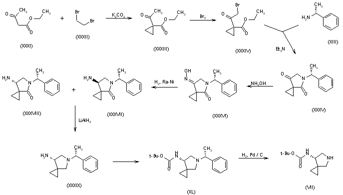 b) The intermediate 7(S)-(tert-Butoxycarbonylamino)-5-azaspiro[2.4]heptane (VII) can also be obtained as follows: 1) The cyclopropanation of ethyl acetoacetate (XXXI) with 1,2-dibromoethane (XXXII) by means of K2CO3 in DMF gives 1-acetylcyclopropane-1-carboxylic acid ethyl ester (XXXIII), which is brominated with Br2 in ethanol yielding the bromoacetyl derivative (XXXIV). The cyclization of (XXXI) with (R)-alpha-methylbenzylamine (XIII) by means of triethylamine affords 5-[1(R)-phenylethyl]-5-azaspiro[2.4]heptane-4,7-dione (XXXV), which by reaction with hydroxylamine is converted into the monooxime (XXXVI). The reduction of (XXXVI) with H2 over RaNi in methanol affords 7-amino-5-[1(R)-phenylethyl]-5-azaspiro[2.4]heptan-4-one as a diastereomeric mixture (XXXVII) + (XXXVIII), which is separated by column chromatography. The reduction of the (7S)-isomer (XXXVIII) with LiAlH4 in THF gives 7(S)-amino-5-[1(R)-phenylethyl]-5-azaspiro[2.4]heptane (XXXIX), which is protected in the usual way to the tert-butoxycarbonyl derivative (XL). Finally, this compound is debenzylated to (VII) by hydrogenation with H2 over Pd/C in ethanol.