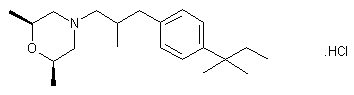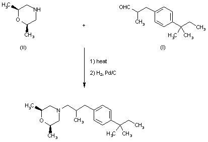By condensation of 3-(4-tert-amylphenyl)propionaldehyde (I) with 2,6-dimethylmorpholine (II) by heating at 100 C in toluene, followed by hydrogenation with H2 over Pd/C in the same solvent.