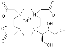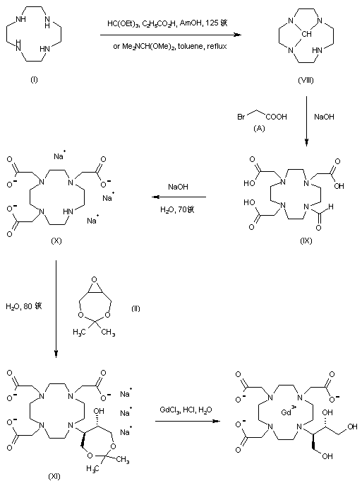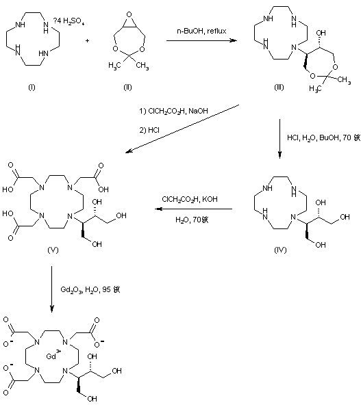1,4,7,10-Tetraazacyclododecane (I) was condensed with 2,3-epoxy-1,4-butanediol acetonide (II) in boiling n-butanol to afford adduct (III). Subsequent acetonide (III) hydrolysis in the presence of HCl led to triol (IV). Alkylation of (IV) with chloroacetic acid furnished the tetraaminotricarboxylic acid (V). Alternatively, compound (V) was prepared by alkylation of (III) with chloroacetic acid, followed by acidic ketal hydrolysis. The title gadolinium complex was finally prepared by treatment of the cyclic tetraamine (V) with gadolinium oxide