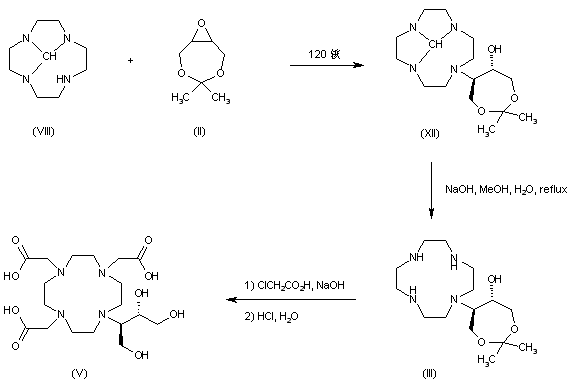 Alternatively, the protected tetraamine (VIII) was condensed with epoxide (II) to afford (XII), which was further hydrolyzed to the mono-substituted tetraazacyclododecane (III) under basic conditions. Alkylation of (III) with chloracetic acid, followed by acidic ketal hydrolysis furnished the precursor (V), which was finally complexed with gadolinium oxide as above