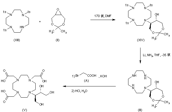 In a related method for obtaining the precursor (V), epoxide (II) was condensed with the tosyl-protected tetraamine (XIII) in an autoclave at 170 C to give (XIV). The N-tosyl groups of (XIV) were then removed by treatment with lithium metal in liquid ammonia, yielding intermediate (III), which was then subjected to alkylation with bromoacetic acid, followed by acid hydrolysis