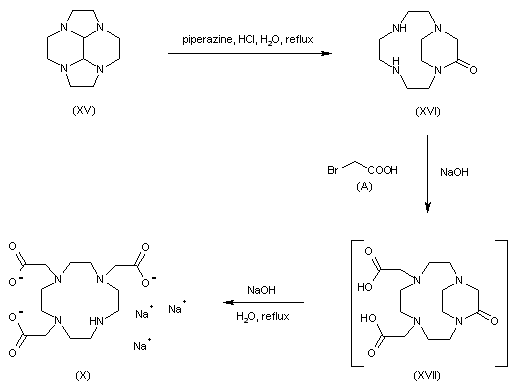 A different synthesis started from the previously reported tetraaza cyclopentaacenaphthylene (XV). Treatment of (XV) with a solution of piperazine at pH 6 gave rise to the bicyclic lactam (XVI). Alkylation of (XVI) with bromoacetic acid, followed by basic lactam hydrolysis furnished the tris(carboxymethyl) derivative (X), which was processed as in Scheme 3.