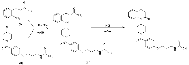 The reductocondensation of 3-(2-aminophenyl)propionamide (I) with 1-[4-(3-acetamidopropoxy)benzoyl]piperidin-4-one (II) by means of H2 and PtO2 in acetic acid gives 3-[2-[1-[4-(3-acetamidopropoxy)benzoyl]piperidin-4-ylamino]phenyl] propionamide (III), which is finally cyclized in refluxing 5% HCl.
