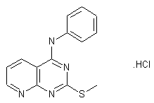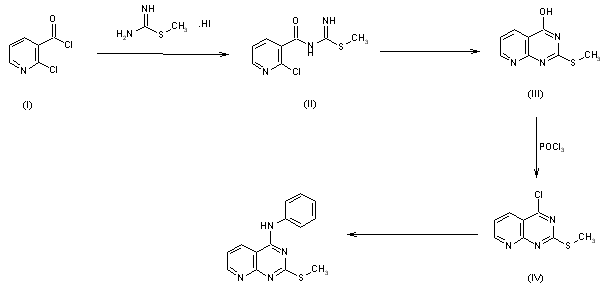 The synthesis of MD-39-AM (V) was carried out as follows: From 2-chloronicotinic acid (as its acyl chloride) (I) and thiourea in triethylamine (1:1:2), compound (II) was obtained. However, in order to avoid the substitution of 2-Cl by sulfur, 2-methylisothiourea was used. By boiling a solution of (II) in dimethylformamide (DMF) for 15 min, (III) (87%) was obtained. Reaction of (III) with phosphorous oxychloride gave 4-chloro-2-(methylthio)pyrido[2,3-d]pyrimidine (IV) (90%). By reacting (IV) with aniline in ethanol, MD-39-AM was obtained.