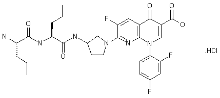 Treatment of ethyl 2,6-dichloro-5-fluoronicotinylacetate (I) with ethyl orthoformate in refluxing acetic anhydride and then with 2,4-difluoroaniline in methylene chloride at room temperature gives the enaminoketo ester derivative (II). Cyclization of (II) with sodium hydride in THF gives ethyl 7-chloro-1-(2,4-difluorophenyl)-6-fluoro-4-oxo-1,4-dihydro-1,8-naphthyridine-3-carboxylate (III). Hydrolysis of (III) with hydrochloric acid yields 7-chloro-1-(2,4-difluorophenyl)-6-fluoro-4-oxo-1,4-dihydro-1,8-naphthyridine-3-carboxylic acid (IV). Condensation of (IV) with 3-tert-butoxycarbonyl-L-norvalyl-L-norvalylaminopyrrolidine (V) in pyridine yields 7-(3-tert-butoxycarbonyl-L-norvalyl-L-norvalylaminopyrrolidin-1-yl)- 1-(2,4-difluorophenyl)-6-fluoro-4-oxo-1,4-dihydro-1,8-naphthyridine-3-carboxylic acid (VI). Hydrolysis of (VI) in trifluoroacetic acid gives A-70826.