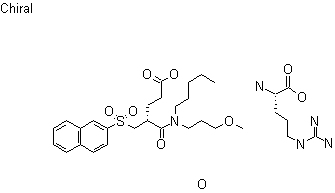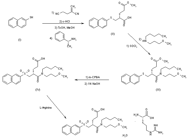 The reaction of 2-naphthalenethiol (I) with 2-methyleneglutaronitrile (II) followed by treatment first with concentrated hydrochloric acid and then with p-toluenesulfonic acid in methanol gives racemic acid, which is resolved into optically pure (R)-4-methoxycarbonyl-2-(2-naphthylthiomethyl)butyric acid (IV) by use of (R)-(+)-alpha-methylbenzylamine (III). The treatment of compound (IV), first with thionyl chloride and then with N-(3-methoxypropyl)-N-pentylamine (V), affords (R)-methyl 4-[N-(3-methoxypropyl)-N-pentylcarbamoyl]-5-(2-naphthylthio)pentanoate (VI). Oxidation of compound (VI) with m-chloroperbenzoic acid followed by treatment with 1N sodium hydroxide gives (R)-4-[N-(3-methoxypropyl)-N-pentylcarbamoyl]-5-(2-naphthylsulfonyl) pentanoic acid (VII), which is finally converted into KSG-504 by treatment with L-arginine.
