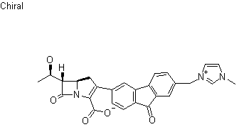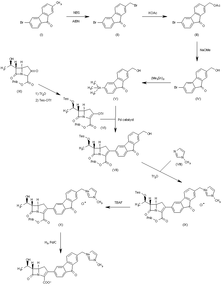 The bromination of 6-bromo-2-methylfluoren-9-one (I) with NBS and AIBN in refluxing CCl4 gives the 2-bromomethyl compound (II), which is treated with potassium acetate in DMF to afford the acetoxymethyl derivative (III). The hydrolysis of (III) with NaOMe in methanol provides the hydroxymethyl compound (IV), which is treated with hexamethyldistannane and Pd(PPh3)4 in refluxing toluene to give the trimethylstannyl derivative (V). The condensation of (V) with the carbapenem triflate (VI) by means of a Pd catalyst in THF yields the adduct (VII), which is condensed with 1-methylimidazole by means of Tf2O in dichloromethane affording the imidazolium derivative (IX). The desilylation of (IX) with TBAF in THF gives the 1-hydroxyethyl derivative (X), which is finally treated with H2 over Pd/C in THF/ethanol/water to obtain the target compound as an inner salt. The intermediate carbapenem triflate (VI) has been obtained by reaction of 2-oxocarbapenam (XI) with Tf2O, followed by silylation with Tes-OTf.