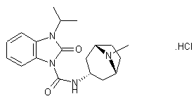 This compound has been obtained by two different ways: 1. The reaction of 2,3-dihydro-1H-benzimidazol-2-one (I) with trichloromethyl chloroformate (II) in THF gives 2-oxo-2,3-dihydro-1H-benzimidazol-2-ylcarbonyl chloride (III), which is condensed with endo-8-methyl-8-azabicyclo[3,2,1]octan-3-amine (IV) in THF, yielding the corresponding amide (V). Finally, this compound is alkylated with ethyl chloride (VI) and NaH in DMF. 2. The condensation of 2-nitrophenyl isocyanate (VII) with endo-8-methyl-8-azabicyclo[3,2,1]octan-3-amine (IV) in THF/cyclohexane gives the corresponding 2-nitrophenylurea (VIII), which is reduced with H2 over Pd/C in ethanol to yield the 2-aminophenylurea (IX). The acylation of (IX) with phenyl chloroformate (X) in toluene affords the carbamate (XI), which is cyclized by means of NaOH in ethanol to afford the amide (V). Finally, this compound is alkylated with ethyl chloride (VI) and NaH in DMF.