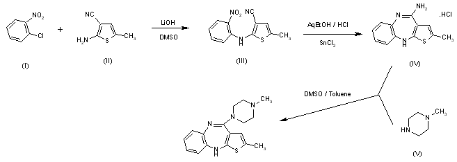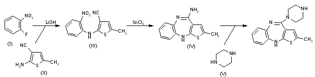 The synthesis of some metabolites of olanzapine have been described: 1) Synthesis of 4'-N-desmethyl olanzapine: The condensation of 2-fluoronitrobenzene (I) with 5-methylthiophene-2-amine (II) by means of LiOH in DMSO gives the expected secondary amine (III), which is cyclized by means of SnCl2 in ethanol yielding 2-methyl-10H-thieno[2,3-b][1,5]benzodiazepine-4-amine (IV). Finally, this compound is condensed with piperazine (V) in toluene/DMSO affording the metabolite 2-methyl-4-(1-piperazinyl)-10H-thieno[2,3-b][1,5]benzodiazepine.