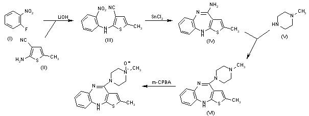 2) Synthesis of olanzapine 4'-N-oxide: The condensation of 2-fluoronitrobenzene (I) with 5-methylthiophene-2-amine (II) by means of LiOH in DMSO gives the expected secondary amine (III), which is cyclized by means of SnCl2 in ethanol yielding 2-methyl-10H-thieno[2,3-b][1,5]benzodiazepine-4-amine (IV). The condensation of (IV) with N-methylpiperazine (V) in toluene/DMSO affords 2-methyl-4-(4-methyl-1-piperazinyl)-10H-thieno[2,3-b][1,5]benzodiazepin e (olanzapine) (VI), which is finally oxidized with m-chloroperbenzoic acid (m-CPBA) in dichloromethane to give the metabolite 2-methyl-4-(4-methyl-4-oxidopiperazinyl-1-yl)-10H-thieno[2,3-b][1,5]benzodiazepine.