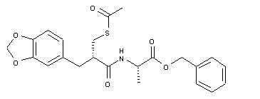 Condensation of piperonyl chloride (I) with diethyl malonate (II) by means of Na in anhydrous refluxing EtOH (NaOEt) provides 2-[3,4-(methylenedioxy)benzyl]malonic acid diethyl ester (III), which is converted into the monoethyl ester (IV) by saponification with KOH in EtOH. Treatment of (IV) with diethylamine in paraformaldehyde/H2O affords acrylic ester (V), which is then subjected to saponification with NaOH in acetone/H2O to provide [3,4-(methylenedioxy)benzyl]-2-propenoic acid (VI). Alternatively, derivative (VI) can also be obtained by following this route: treatment of piperonal (VII) with diethyl malonate (II) in refluxing toluene in the presence of piperidine and acetic acid provides diethyl piperonylidene malonate (VIII), which is then hydrogenated over Pd/C to furnish diethyl piperonylmalonate (IX). Saponification of the ethyl ester moiety of (IX) by refluxing with NaOH in H2O affords piperonylmalonic acid (X), which is finally converted into intermediate (VI) by decarboxylation by treatment with diethylamine in refluxing paraformaldehyde. Reaction of (VI) with thioacetic acid at 70 C affords a racemic mixture of propionic acid derivatives (XI), which is resolved by first formation of a chiral salt (either by reaction with (R)-alpha-methylbenzylamine or by reaction with (+)-ephedrine in ether), recrystallization of the corresponding diastereomer and finally liberation of the 2-(S)-(acetylthiomethyl)-3-[3,4-(methylenedioxy)benzyl]propionic acid [(S)-(XII)] by hydrolysis with HCl in H2O/CH2Cl2. Finally, fasidotril is obtained by condensation of (S)-(XII) with benzyl alaninate (XIII) by means of HOBt and DCC in THF/CHCl3 in the presence of Et3N.