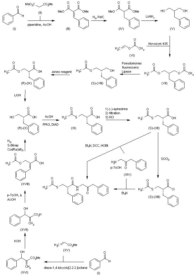Reaction of benzaldehyde (I) with dimethyl malonate (II) in refluxing toluene in the presence of piperidine and HOAc provides dimethyl benzylidene malonate (III), which is then hydrogenated over Pd/C to afford dimethyl benzyl malonate (IV). Reduction of (IV) with LiAlH4 in refluxing THF furnishes 2-benzyl-1,3-propanediol (V), which is then subjected to reaction with vinyl acetate (VI) by means of Novozym 435 enzyme to yield diacetate (VII). Enantioselective removal of one acetyl group from (VII) by treatment with Pseudomonas fluorescens Lipase in acetone/phosphate buffer (pH = 7) at 30 C gives 3-acetoxy-2(S)-benzyl-propanol (S)-(VIII), which is then oxidized by means of Jones reagent in acetone/isopropanol to provide carboxylic acid (R)-(IX). The hydrolysis of (IX) with LiOH in THF/H2O gives 2(R)-benzyl-3-hydroxypropanoic acid (R)-(X). Alternatively, intermediate (X) can also be synthesized as follows: Condensation of benzaldehyde (I) with methyl acrylate (XV) by means of diaza-1,4-bicyclo[2.2.2.]octane affords methyl beta-hydroxy-alpha-methylene-benzenepropanoate (XVI), which is then subjected to hydrolysis with KOH in MeOH/H2O to yield carboxylic acid (XVII). Treatment of (XVII) with p-toluenesulfonic acid in refluxing HOAc gives (E)-2-(acetoxymethyl)-3-phenylpropionic acid (XVIII), which is finally converted into (X) by enantioselective hydrogenation in the presence of S-Binap and ruthenium catalyst [CodRu(all)2]. Derivative (R)-(X) is then converted into 3-(acetylsulfanyl)-2(S)-benzylpropionic acid (XI) by means of a Mitsunobu reaction with thioacetic acid, diisopropyl azodicarboxylate (DIAD) and triphenylphosphine (PPh3). Compound (XI) is then subjected to optical purification by formation and isolation of the corresponding salt with (-)-ephedrine and subsequent hydrolysis with HCl to furnish enantiomerically pure (S)-(XII). Finally, carboxylic acid (S)-(XII) is converted into ecadotril by its coupling with benzyl glycinate (XIV), either by means of Et3N, DCC and HOBt in CHCl3, or by first reaction with thionyl chloride to give acid chloride (S)-(XIII) and subsequent coupling with glycinate (XIV) by means of Et3N in CH2Cl2.