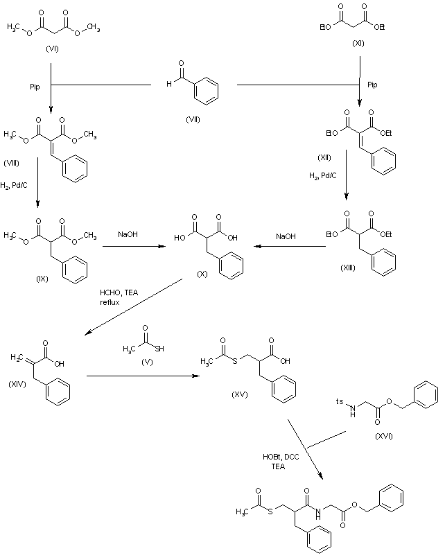 Alternatively, the condensation of dimethyl malonate (VI) with benzaldehyde (VII) by means of piperidine in refluxing toluene gives dimethyl benzylidenemalonate (VIII), which is reduced with H2 over Pd/C in toluene to yield the corresponding benzyl derivative (IX). The hydrolysis of (IX) with NaOH in water affords the benzylmalonic acid (X). Alternatively, intermediate (X) can also be obtained starting from diethyl malonate (XI), which is condensed with with benzaldehyde (VII) by means of piperidine in refluxing toluene to give diethyl benzylidenemalonate (XII). Reduction of (XII) with H2 over Pd/C in toluene yields the corresponding benzyl derivative (XIII), which is then hydrolized with NaOH in water. The monodecarboxylation of (X) and its condensation with paraformaldehyde and diethylamine in refluxing ethyl acetate provides 2-benzylacrylic acid (XIV), which is condensed with thioacetic acid (V) by heating at 70 C to afford 2-(acetylsulfanylmethyl)-3-phenylpropionic acid (XV). Finally, this compound is condensed with N-tosylglycine benzyl ester (XVI) by means of HOBt, DCC and TEA in THF.