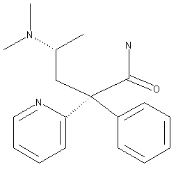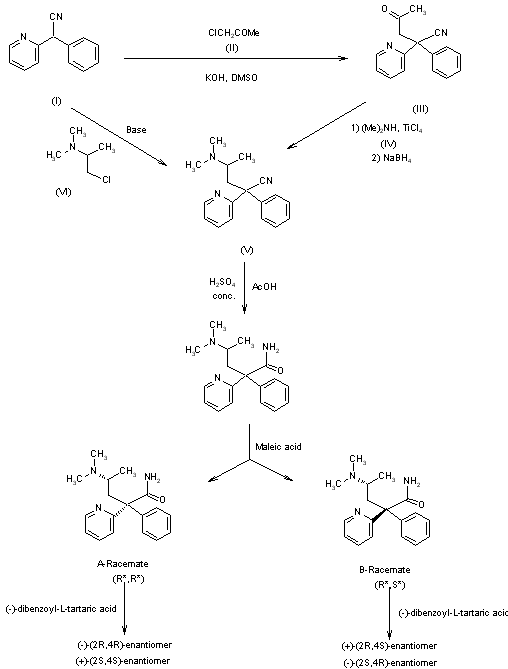 Vamicamide is synthesized by two closely related ways (1). Scheme 1: 1) The alkylation of 2-phenyl-2-(2-pyridyl)acetonitrile (I) with chloroacetone (II) is achieved in the presence of KOH in DMSO to give the 4-oxopentanenitrile derivative (III). Compound (III) is then converted to (V) by reaction with dimethylamine (IV) using titanium tetrachloride and successive reduction with NaBH4. The nitrile (V) (a mixture of two diastereoisomers) is hydrolyzed with concentrated H2SO4 in acetic acid to give the final pentanamide derivative as a racemic mixture of two diastereoisomers, A-racemate and B-racemate. Separation is accomplished by recrystallization of their maleic acid salts. The racemates are resolved by recrystallization with (-)-dibenzoyl-L-tartaric acid. 2) The reaction of 2-phenyl-2-(2-pyridyl)acetonitrile (I) with 2-(dimethylamino)propylchloride (VI) using a base affords the intermediate (V), which is hydrolyzed with concentrated sulfuric acid in acetic acid to give the final pentanamide derivative as a mixture of two diastereoisomers. These are resolved by recrystallization.