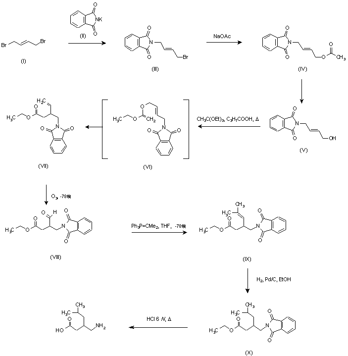 | 合成路线图解说明: Substitution on dibromobutene (I) by potassium phthalimide (II) provided bromobutenyl phthalimide (III). Further treatment with sodium acetate afforded acetate (IV) which, after hydrolysis, gave phthalimidobutenol (V). Reaction with refluxing ethyl orthoacetate in the presence of a trace of butyric acid generated the intermediate ketene acetal (VI), which experienced a Claisen rearrangement to give pentenoate ester (VII). Ozonolysis of the olefinic double bond of (VII) yielded aldehyde (VIII). Then, Wittig reaction of aldehyde (VIII) with (isopropylidene)triphenylphosphorane in cold THF provided olefin (IX), which was hydrogenated in the presence of Pd/C to give the isobutyl compound (X). Finally, hydrolysis of both ester and phthalimide groups in refluxing 6 N HCl provided the GABA analogue. |