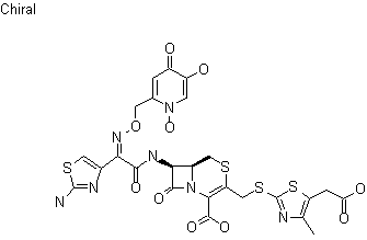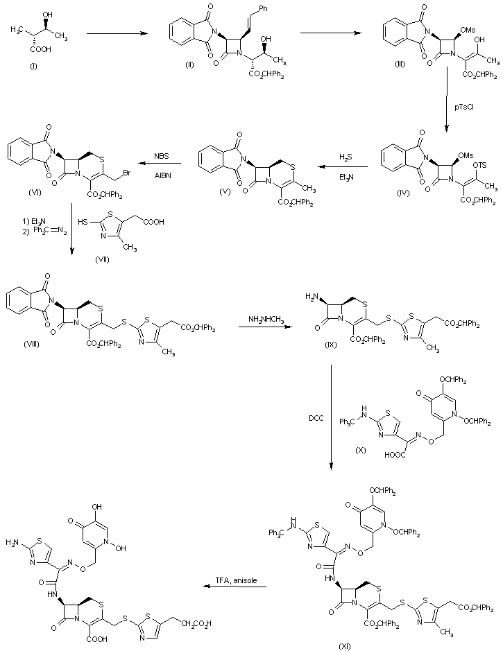 The D-threonine (I) is converted into the azetidinone (II), and into the enol (III) according to (Tsubouchi, H., et al. Tetrahedron Assimetry, 1944, 5: 441). The tosylation of (III) with tosyl chloride and N-methylpyrrolidine yielded the tosylated enol (IV), which was cyclized with H2S and triethylamine to the isocephem derivative (V). The chlorination of (V) with N-bromosuccinimide (NBS) and AIBN affords the bromomethyl derivative (VI), which is treated with 2-(4-methyl-2-sulfanylthiazol-5-yl)acetic acid (VII) and triethylamine or NaHCO3 and then esterified with diphenyldiazomethane to give the expected condensation product (VIII). The reaction of (VIII) with methylhydrazine cleaves the phthalimide group affording (IX), which is then amidated wih the acetic acid derivative (X) by means of dicyclohexylcarbodiimide (DCC) givig the fully protected final product (XI). Finally, this compound is treated with trifluoroacetic acid to eliminate the diphenyl nad triphenyl protecting groups.