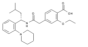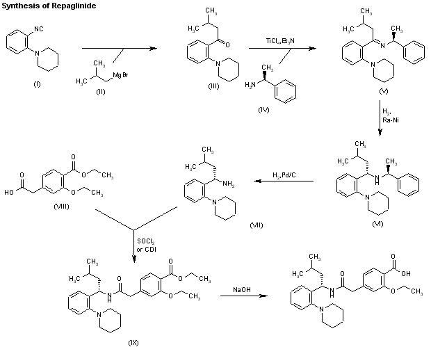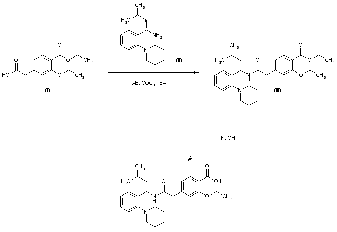 The condensation of 2-[3-ethoxy-4-(ethoxycarbonyl)phenyl]acetic acid (I) with 3-methyl-1(S)-(2-(1-piperidinyl)phenyl)butylamine (II) by activation with pivaloyl chloride and TEA in toluene gives the corresponding amide (III), which is finally hydrolyzed by means of NaOH water/denaturated spirit to afford the target Repaglinide.