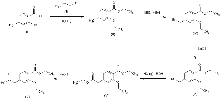 The reaction of 2-hydroxy-4-methylbenzoic acid (I) with ethyl bromide (II) and K2CO3 in acetone at 150 C gives 2-ethoxy-4-methylbenzoic acid ethyl ester (III), which is brominated with Br2 and AIBN in CCl4 to yield the bromomethyl derivative (IV). The reaction of (IV) with NaCN and benzyl-tributylammonium chloride affords the cyanomethyl compound (V), which is hydrolyzed with HCl (g) in refluxing ethanol to provide 2-ethoxy-4-(ethoxycarbonylmethyl)benzoic acid ethyl ester (VI). Finally, this compound is selectively hydrolyzed with 2N NaOH in ethanol to furnish the target intermediate, the 2-[3-ethoxy-4-(ethoxycarbonyl)phenyl]acetic acid (VII).