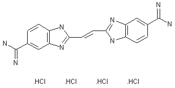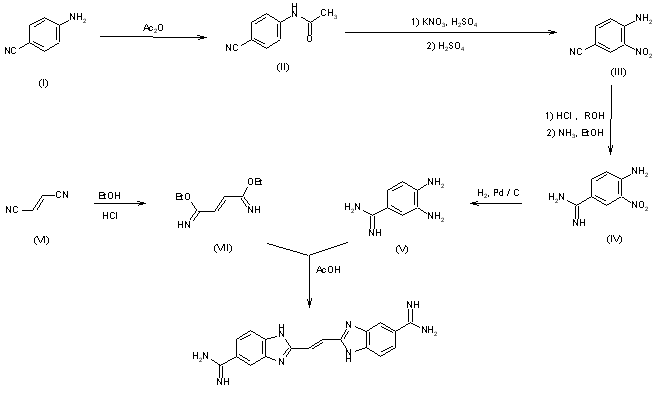The synthesis of BBE was accomplished using a modified version of a published procedure, as outlined in Scheme 17960101a: Following acetylation (II) of the amine group, 4-aminobenzonitrile (I) was nitrated with potassium nitrate and the acetyl group removed with boiling sulfuric acid to give the mono-nitro product (III). The nitrile was converted to the corresponding amidine in two steps via the Pinner amidine synthesis (1, 2) to give 4-amino-3-nitrobenzamidine (IV). Reduction of the nitro group with 10% Pd-C in a Parr hydrogenator afforded a 60% yield (from compound I) of 3,4-diaminobenzamidine (V). The di-imidate (VII) of fumaronitrile (VI) was prepared by reacting the dinitrile in freshly distilled ethanol with dry HCl gas at 10 C. The di-imidate (VII) was reacted immediately with a 1/2 molar equivalent of 3,4-diaminobenzamidine in refluxing glacial acetic acid. The final product was isolated by trituration with ethyl acetate and filtration. BBE was purified by two recrystallizations from 4% HCl. The yield of the purified product was 15%.