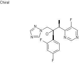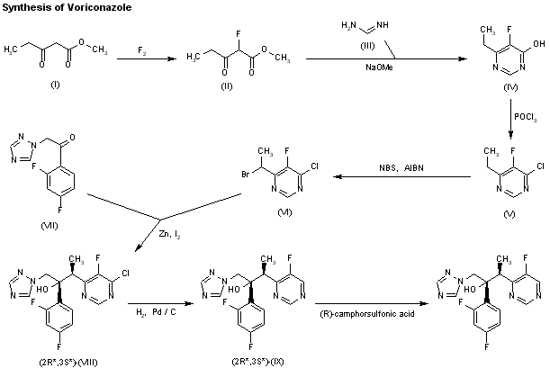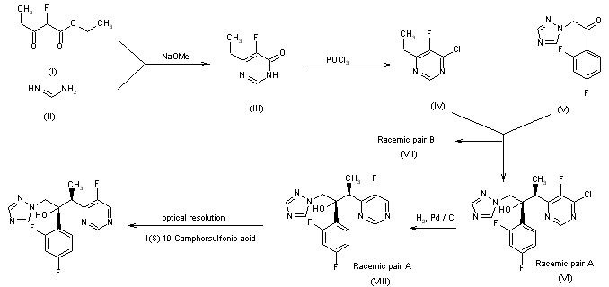 The fluorination of 3-oxopentanoic acid methyl ester with F2 gas gives 2-fluoro-3-oxopentanoic acid methyl ester (II), which is cyclized with formamidine (III) by means of NaOMe yielding 6-ethyl-5-fluoropyrimidin-4-ol (IV). Reaction of (IV) with POCl3 and TEA in dichloromethane affords 4-chloro-6-ethyl-5-fluoropyrimidine (V), which is brominated with NBS and AIBN in dichloromethane to provide 6-(1-bromoethyl)-4-chloro-5-fluoropyrimidine (VI). Compound (VI) is condensed with 1-(2,4-difluorophenyl)-2-(1,2,4-triazol-1-yl)ethanone (VII) by means of I2 and Zn in THF furnishing a mixture of the diastereomeric racemates (2R*,3R*)- and (2R*,3S*)-3-(6-chloro-5-fluoro-4-pyrimidinyl)-2-(2,4-difluorophenyl)-1-(1H-1,2,4-triazol-1-yl)-2-butanol (VIII) in a 1:10.3 molar ratio. The reductive dechlorination of (2R*,3S*)-(VIII) with H2 over Pd/C gives the (2R*,3S*)-racemate (IX), which is submitted to optical resolution by means of crystallization with (1R)-10-camphorsulfonic acid.