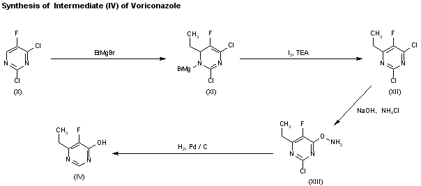 Alternatively, 6-ethyl-5-fluoropyrimidin-4-ol (IV) can be obtained by reaction of 2,4-dichloro-5-fluoropyrimidine (X) with ethylmagnesium bromide in THF to give the dihydropyrimidine derivative (XI), which is aromatized by reaction with I2 and TEA in THF yielding 2,4-dichloro-6-ethyl-5-fluoropyrimidine (XII). The reaction of (XII) with NaOH and NH4Cl affords the aminooxy derivative (XIII) which is finally submitted to a reductive dechlorination and deamination with H2 over Pd/C in ethanol/water.