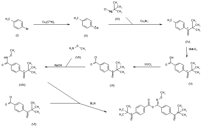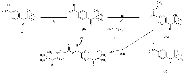 The reaction of 4-(pivaloyl)benzoic acid (I) with refluxing SOCl2 gives the corresponding acyl chloride (II), which is condensed with methoxyamine (III) by means of NaOH in THF to yield N-methoxy-4-(pivaloyl)benzamide (IV). Finally, this compound is condensed with more acyl chloride (II) by means of triethylamine in toluene.