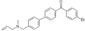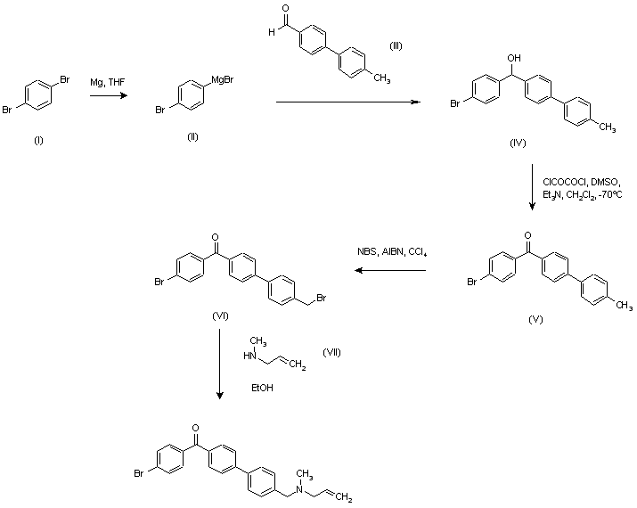 | 合成路线图解说明: Grignard reagent (II) prepared from 1,4-dibromobenzene (I) was condensed with biphenylaldehyde (III) to afford alcohol (IV), which was oxidized to ketone (V) under Swern conditions with oxalyl chloride and DMSO at low temperature. Then, allylic bromination with N-bromosuccinimide (NBS) in the presence of azobisisobutyronitrile (AIBN) gave (VI). Finally, N-allyl-N-methylamine (VII) was alkylated with bromide (VI) to provide the tertiary amine. |