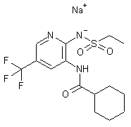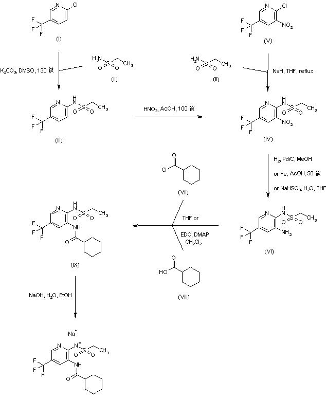 Nucleophilic displacement of 2-chloro-5-(trifluoromethyl)pyridine (I) with ethanesulfonamide (II) in the presence of K2CO3 in hot DMSO afforded the N-pyridyl sulfonamide (III). Subsequent nitration of (III) with fuming nitric acid in HOAc gave the 3-nitro derivative (IV). Preparation of this intermediate was also reported by displacement of 2-chloro-3-nitro-5-(trifluoromethyl)pyridine (V) with the sodium salt of ethanesulfonamide (II). Subsequent reduction of the nitro group of (IV) to the corresponding 3-aminopyridine (VI) was carried out by means of catalytic hydrogenation, iron in HOAc, or sodium hydrosulfite as the reducing agents. Amine (VI) was coupled either with cyclohexanecarbonyl chloride (VII) or with cyclohexanecarboxylic acid (VIII) in the presence of EDC to produce the cyclohexanecarboxamide (IX). The acidic sulfonamide NH group of (IX) was finally converted to the sodium salt by treatment with NaOH.