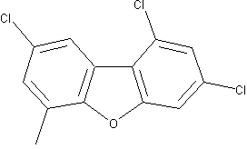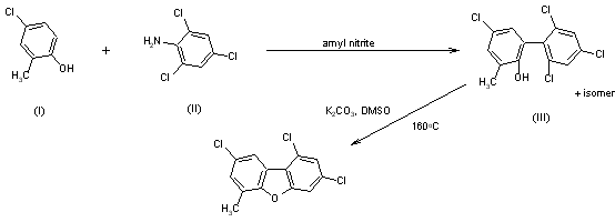 | 合成路线图解说明: 4-Chloro-2-methylphenol (I) is condensed with 2,4,6-trichloroaniline (II) by heating to 120-140 C with amyl nitrite for 18 hours. The excess phenol is removed in vacuo; the residue is adsorbed on silica gel, applied to the top of a silica gel column and the crude phenolic fraction isolated by elution with hexane/acetone (95:5). The phenolic fraction, which contains 2-methyl-2'4,4',6-tetrachlorobiphenylol (III) and other isomers, is dissolved in dimethyl sulfoxide, anhydrous sodium carbonate is added, and the mixture is then heated with stirring at 160 C for 2 hours. The cyclization product, 1,3,8-trichloro-6-methyldibenzofuran (MCDF) is isolated by column chromatography and further purified by crystallization from methanol or methanol/anisole. |