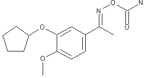 | 合成路线图解说明: The alkylation of isovanillin (I) with cyclopentyl bromide (II) and K2CO3 in DMF gives 3-(cyclopentyloxy)-4-methoxybenzaldehyde (III), which is methylated with MeLi in THF yielding the 1-phenylethanol (IV). The oxidation of (IV) with pyridinium dichromate (PDC) in dichloromethane affords the corresponding acetophenone (V), which is treated with NH2OH in pyridine to afford the oxime (VI). Finally, this oxime is treated with NaOCN and TFA in dichloromethane, or with chlorosulfonyl isocyanate in THF. |