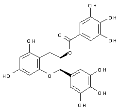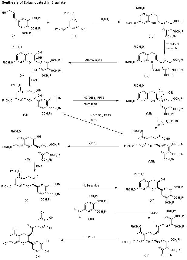 | 合成路线图解说明: An enantioselective synthesis of epigallocatechin-3-gallate has been reported: The condensation of 3,4,5-tris(benzyloxy)cinnamyl alcohol (I) with 3,5-bis(benzyloxy)phenol (II) by means of H2SO4 gives the diphenylpropene derivative (III), which is silylated with TBDMS-Cl and imidazole to yield the silyl ether (IV). The asymmetric dihydroxylation of (IV) with AD-mix-alpha affords diol (V), which is desilylated with TBAF in THF providing the trihydroxy compound (VI). Esterification of (VI) with triethyl orthoformate and pyridinium p-toluenesulfonate (PPTS) at room temperature gives the cyclic orthoester (VII), which is treated with the same reactants at 60 癈 to yield the benzopyran (VIII). Compound (VIII) can also be obtained directly from (VI) by treatment with triethyl orthoformate and PPTS at 60 癈. The hydrolysis of the formate group of (VIII) with K2CO3 in methanol affords alcohol (IX), which is oxidized to the corresponding ketone (X) with Dess-Martin periodinane (DMP) in dichloromethane. The reduction of (X) with L-Selectride in THF provides the chiral cis-alcohol (XI), which is esterified with 3,4,5-tris(benzyloxy)benzoyl chloride (XII) and DMAP in dichloromethane giving rise to the protected ester (XIII). Finally, this compound is debenzylated by hydrogenation with H2 over Pd/C in methanol/THF. |