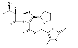 This compound is prepared by several related ways: 1) The reaction of silylated azetidinone (I) with tetrahydrofuran-2-thiocarboxylic acid (II) by means of NaOH in THF - water gives the azetidinone thioester (III), which is condensed with allyl glyoxylate in refluxing benzene yielding the hydroxyester (IV). The reaction of (IV) with SOCl2 affords the chloroester (V), which by reaction with triphenylphosphine by means of lutidine in hot THF is converted into the phosphoranylidene derivative (VI). The elimination of the silyl protecting group of (VI) with tetrabutylammonium fluoride gives the azetidinone (VII), which is cyclized in refluxing toluene yielding the (5R,6S)-6-[1(R)-hydroxyethyl]-2-[2(R)-tetrahydrofuryl]penem-3-carboxyli c acid allyl ester (VIII). Finally, this compound is hydrolyzed with triphenylphosphine, sodium 2-ethylhexanoate and Pd-tetrakis(triphenylphosphine). 2) The condensation of the silver salt of protected azetidinone (IX) with tetrahydrofuran-2(R)-carbonyl chloride (X) also yields the phosphoranylidene salt (VI). 3) Phosphoranylidene ester (VI) can also be cyclized first in refluxing benzene yielding the silylated penem ester (XI), which is deprotected with tetrabutylammonium fluoride to (VIII). 4) The hydrolysis of allyl ester (VIII) to the final product can also be performed with paladium tetrakis(triphenylphosphine) and sodium 4-(methoxycarbonyl)-5,5-dimethylcyclohexane-1,3-dione enolate in several different solvents such as methyl acetate, ethylacetate, tetrahydrofuran, dioxane, sec-butanol, acetonitrile, acetone, 2-butanone, 1,2-dichloroethane, chlorobenzene, toluene, or ethylene glycol dimethyl ether. 5) The preceding hydrolysis can also be performed with triphenylphosphine and paladium tetrakis(triphenylphosphine) with sodium propionate, sodium acetate or sodium lactate in tetrahydrofuran or acetone.