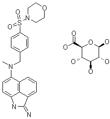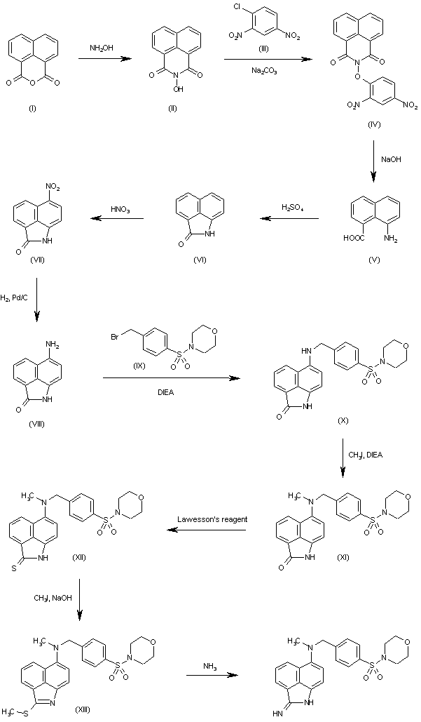 The reaction of 1,8-naphthoic anhydride (I) with hydroxylamine and NaOAc in water gives the N-hydroxynaphthalimide (II), which is condensed with 2,4-dinitrochlorobenzene (III) by means of Na2CO3 in hot water yielding the expected naphthalimide derivative (IV). The rearrangement of (IV) induced by NaOH in ethanol/water affords 8-amino-1-naphthoic acid (V), which is cyclized by means of sulfuric acid to the benz[cd]indolin-2-one (VI). The nitration of (VI) with HNO3 in acetic aid gives the expected 6-nitro derivative (VII), which is reduced with H2 over Pd/C in THF to the corresponding amino derivative (VIII). The condensation of (VIII) with the benzyl bromide (IX) by means of DIEA in hot DMF affords the secondary amine (X), which is methylated with methyl iodide and DIEA in hot DMF to provide the tertiary amine (XI). The reaction of the carbonyl group of (XI) with Lawesson's reagent gives the thione (XII), which is methylated with methyl iodide and NaOH to give the methylsulfanyl derivative (XIII). Finally, this compound is treated with ammonia in methanol.