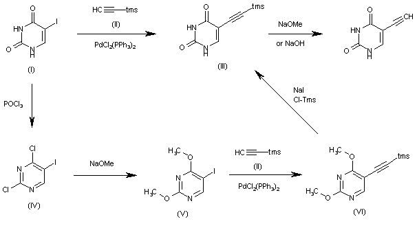 This compound has been obtained by two similar ways: 1. The reaction of 5-iodouracil (I) with trimethylsilylacetylene (II) by means of PdCl2(PPh3)2 and CuI2 in TEA/DMF gives 5-(trimethylsilylethynyl)uracil (III), which is then desilylated with sodium methoxide or NaOH in methanol. 2. The reaction of 5-iodouracil (I) with POCl3 at 120 C catalyzed by N,N-diethylaniline gives 2,4-dichloro-5-iodopyrimidine (IV), which by reaction with NaOMe in methanol is converted into 2,4-dimethoxy-5-iodopyrimidine (V). The condensation of (V) with trimethylsilylacetylene by means of PdCl2(PPh3)2 and CuI2 in TEA/DMF yields 2,4-dimethoxy-5-(trimethylsilylethynyl)pyrimidine (VI), which is treated with NaI and Tms-Cl in refluxing acetonitrile to afford 5-(trimethylsilylethynyl)uracil (III).