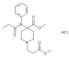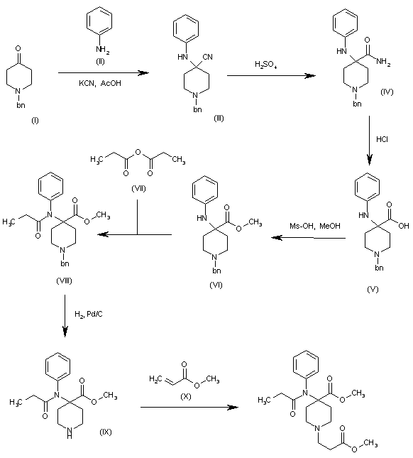The reaction of 1-benzyl-4-piperidone (I) with aniline (II) and KCN in acetic acid gives the aminonitrile (III), which is treated with H2SO4 at room temperature to yield the carboxamide (IV). The hydrolysis of (IV) with refluxing aqueous HCl affords the carboxylic acid (V), which is esterified with Ms-OH and methanol to provide the methyl ester (VI). Acylation of the NH group of (VI) with propionic anhydride (VII) gives the propionamide (VIII), which is debenzylated with H2 over Pd/C to yield the piperidine (IX). Finally, this compound is condensed with methyl acrylate (XI) in acetonitrile to afford the target compound.