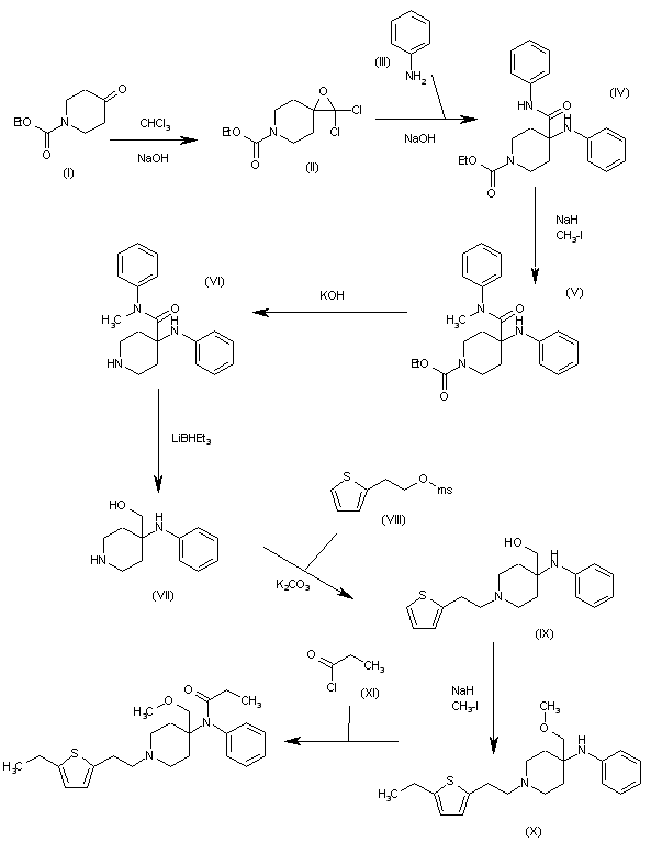 The reaction of 4-oxopiperidine-1-carboxylic acid ethyl ester (I) with CHCl3, benzyl triethylammonium chloride and NaOH in THF/water gives the spirooxirane (II), which is treated with aniline (III) and NaOH to yield the anilide (IV). The methylation of the amide nitrogen by means of NaH and CH3I in THF affords the methylated anilide (V). The reaction of (V) with KOH in refluxing isopropanol causes elimination of its ethoxycarbonyl group, providing compound (VI), which is reduced with lithium triethylborohydride in THF to give 4-(hydroxymethyl)-4-(phenylamino)piperidine (VII). The condensation of (VII) with 2-(2-thienyl)ethyl mesylate (VIII) by means of K2CO3 in refluxing acetonitrile yields the adduct (XI), which is methylated with NaH and CH3I in THF to afford the methoxy derivative (X). Finally, this compound is acylated with propionyl chloride (XI) in chloroform to provide the target compound.