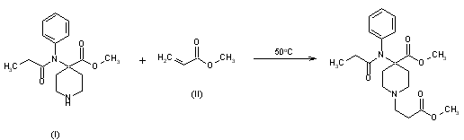 By condensation of 4-(N-phenylpropionamido)piperidine-4-carboxylic acid methyl ester (I) with acrylic acid methyl ester (II) in hot acetonitrile.