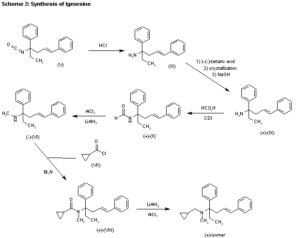 2) Igmesine has been synthesized as follows: Hydrolysis of the previously described isocyanate (V) with HCl in refluxing THF/water gives the corresponding amine (IX), which is submitted to optical resolution with L-(-)tartaric acid, yielding the (+)-isomer (+)-(IX). The acylation of (+)-(IX) with formic acid and carbonyldiimidazole (CDI) affords the expected formamide (+)-(X), which is reduced with AlAl3/LiAlH4 in THF/ethyl ether, giving (-)-N-(1-ethyl-1,4-diphenyl-3-butenyl)-N-metylamine (-)-(VI). The condensation of (-)-(VI) with cyclopropanecarbonyl chloride (VII) by means of triethylamine in dichloromethane yields the corresponding amide (+)-(VIII), which is finally reduced with AlCl3/LiAlH4 in THF/ethyl ether.