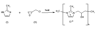MCI-196 is synthesized by condensation of 2-methylimidazole (I) with epichlorohydrin (II) as follows: Equimolecular parts (0.5 M: 0.5 M) of (I) and (II) were allowed to condense in water (100 ml) at 90 C for 14 h; then 0.094 mol of (II) wa added and the reaction continued for 2 h at 45 C. The resulting resin was treated with 0.094 M of a 20% aqueous solution of NaOH and heated at 45 C for 2 h more. Finally, heat curing of the resin at 120 C for 5 h was performed. The resin was isolated by precipitation with water.
