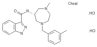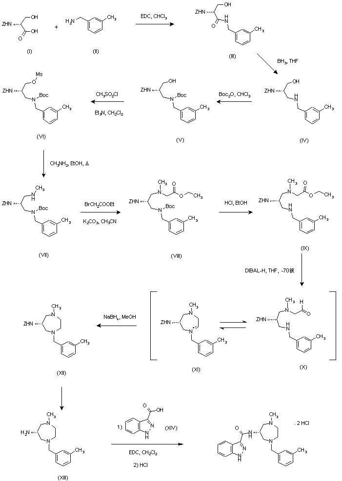 Condensation of N-benzyloxycarbonyl-D-serine (I) with 3-methylbenzylamine (II) in the presence of 1-ethyl-3-[3-(dimethylamino)propyl]carbodiimide.HCl (EDC) afforded amide (III). Reduction of this amide with borane gave amine (IV), which was then protected as the tert-butyl carbamate (V) with Boc2O. Subsequent treatment of (V) with methanesulfonyl chloride produced the corresponding mesylate (VI) which, without purification, was treated with methylamine in refluxing EtOH to provide triamine (VII). Alkylation of (VII) with methyl bromoacetate gave aminoacetate (VIII), and then, the tert-butoxycarbonyl protecting group was removed using HCl in EtOH. The resulting (IX) was treated with diisobutyl aluminum hydride in THF at -70 C to give aldehyde (X), and further reduction with NaBH4 of iminium salt (XI), derived from aldehyde (X), provided the optically active diazepine (XII). Deprotection of the benzyloxycarbonyl group, followed by coupling of the resulting amine (XIII) with indazole-3-carboxylic acid (XIV) in the presence of EDC gave the target amide, which was then converted to the dihydrochloride.