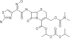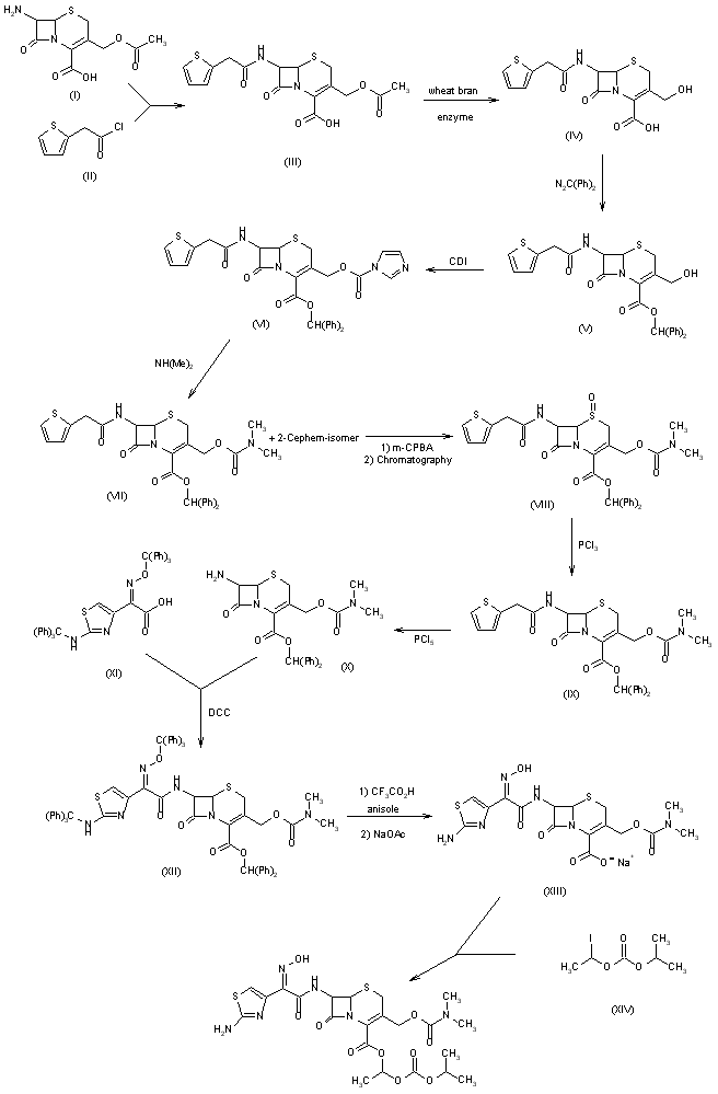 1) The acylation of 7-aminocephalosporanic acid (I) with 2-thienylacetyl chloride (II) gives the acylated compound (III), which is treated with wheat bran enzyme to obtain 3-(hydroxymethyl)-7-(2-thienylacetamido)-3-cephem-4-carboxylic acid (IV). The esterification of (IV) with diphenyldiazomethane affords the corresponding diphenylmethyl ester (V), which is treated with carbonyldiimidazole (CDI) in THF to yield the imidazolecarbonyl ester (VI). The reaction of (VI) with dimethylamine in ethyl acetate/water gives the dimethylcarbamoyl derivative (VII) as a mixture of the 3- and 2-cephem derivatives, which is oxidized with m-chloroperbenzoic acid to the corresponding S-oxides and separated by column chromatography to give pure 3-cephem derivative (VIII). Elimination of the oxide group of (VIII) with PCl3 in DMF affords 3-(dimethylcarbamoyloxymethyl)-7-(2-thienylacetamido)-3-cephem-4-carboxylic acid diphenyl ester (IX), which is treated with PCl5 and pyridine to obtain compound (X) with a free amino group. The acylation of (X) with 2-[2-(tritylamino)thiazol-4-yl]-2(Z)-(trityloxyimino)acetic acid (XI) by means of dicyclohexylcarbodiimide (DCC) gives the fully protected cephem derivative (XII), which is deprotected with trifluoroacetic acid and anisole to yield 7-[2-(2-aminothiazol-4-yl)-2(Z)-(hydroxyimino)acetamido]-3-(N,N-dimethylcarbamoyloxymethyl)-3-cephem-4-carboxylic acid sodium salt (XIII). Finally, this compound is esterified with 1-(isopropoxycarbonyloxy)ethyl iodide (XIV) in DMF.