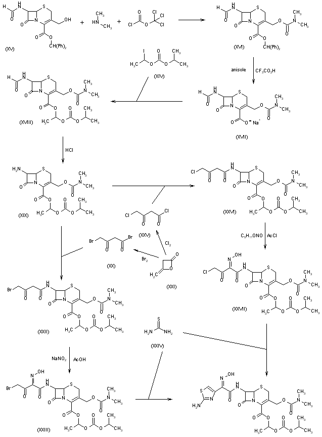 2) The condensation of 7-(formamido)-3-(hydroxymethyl)-3-cephem-4-carboxylic acid diphenylmethyl ester (XV) with trichloromethyl chloroformate and dimethylamine in THF gives the corresponding dimethylcarbamoyloxy derivative (XVI), which is hydrolyzed with trifluoroacetic acid and anisole to the corresponding acid (as Na salt) (XVII). The esterification of (XVII) with 1-(isopropoxycarbonyloxy)ethyl iodide (XIV) in DMF as before affords the corresponding ester (XVIII), which is deformylated with HCl in methanol/THF to the 7-amino derivative (XIX). The acylation of (XIX) with 4-bromo-3-oxobutyryl bromide (XX) (obtained from diketene (XXI) with Br2) by means of bis(trimethylsilyl)acetamide in dichloromethane affords the 7-(4-bromo-3-oxobutyramido)-derivative (XXII), which is treated with NaNO2 and acetic acid to obtain the hydroxyimino compound (XXIII). Finally, this compound is cyclized with thiourea in dimethylacetamide. 3) The 7-amino cephem derivative (XIX) can also be acylated with 4-chloro-3-oxobutyryl chloride (XXV) (obtained from diketene (XXI) with Cl2) to yield the 7-(4-chloro-3-oxobutyramido)-derivative (XXVI), which is treated with amyl nitrite and acetyl chloride to afford the hydroxyimino compound (XXVII). Finally, this compound is cyclized with thiourea as before.