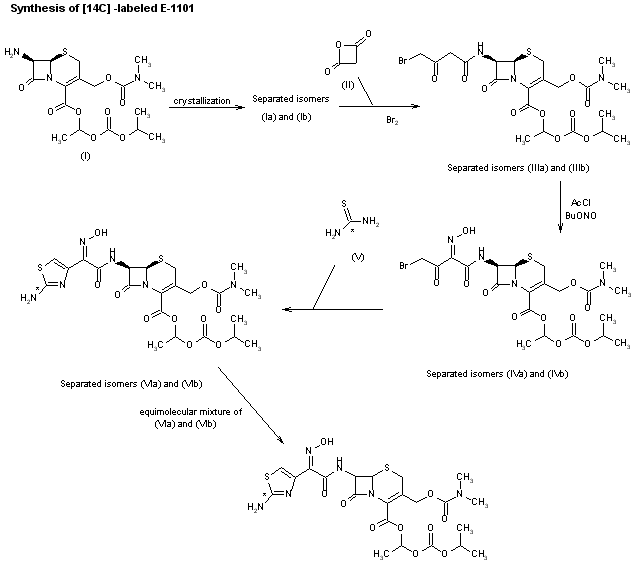 The synthesis of [14C]-labeled E-1101 has been reported: (6R,7R)-7-Amino-3-(N,N-dimethylcarbamoyloxymethyl)-3-cephem-4-carboxyli c acid 1-(isopropoxycarbonyloxy)ethyl ester (I) is a diastereomeric mixture (Ia and Ib) due to the asymmetric carbon in the ester group. These isomers are separated by crystallization in THF and submitted separately to the following reaction sequence: The reaction of (Ia) and (Ib) with diketene (II) and Br2 gives the 4-bromo-3-oxobutyrylamides (IIIa and IIIb), which by oxidation with acetyl chloride and butylnitrite in dichloromethane yield the hydroxyimino derivatives (IVa and IVb). The cyclization of (IVa) and (IVb) with [14C]-labeled thiourea (V) in dimethylacetamide affords the two labeled diastereomeric E-1101 compounds (VIa and VIb), which are finally mixed equimolecularly to obtain the labeled E-1101 racemic at the ester group.