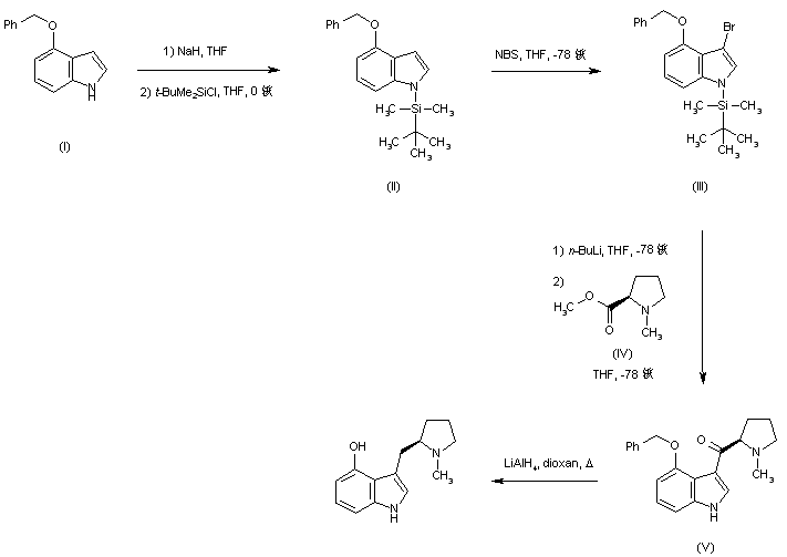 Silylation of 4-benzyloxyindole (I) employing tert-butyldimethylsilyl chloride and NaH gave the N-silyl derivative (II), which was brominated with N-bromosuccinimide at -78 C to afford the 3-bromoindole (III). After lithium-bromine exchange with n-BuLi at -78 C, the 3-lithio compound was condensed with N-methyl-D-proline methyl ester (IV) to give the indolyl ketone (V). The ketone function of (V) was finally reduced employing LiAlH4 in boiling dioxan, with concomitant cleavage of the benzyl ether to furnish the title compound.